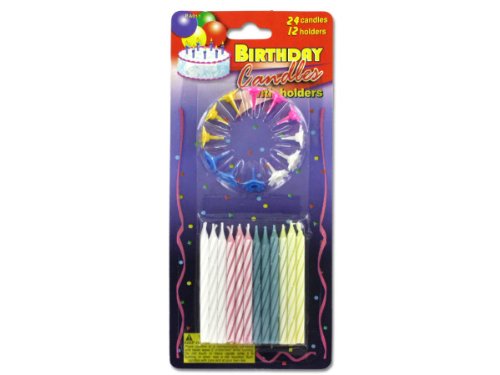 Give that birthday cake a bit more kick with this set Set includes 24 candles and 12 holders Holders are coordinated in color to the candles and allow the candles to sit in the holders and above the cake White pink blue and yellow Comes packaged on a blister card with hanging hole Candles m